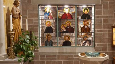 On St. Joseph’s Day, March 19, 2021 a beautiful new addition to the sanctuary of our church was unveiled and blessed: a stained glass window, next to the baptismal font, depicting 10 Saints and Blesseds who have lived in recent centuries, and who represent all the states of life in the Church: married life, the priesthood, the consecrated life, and single life. The Saints and Blesseds who are depicted in this stained glass window are: Saint Gianna Beretta Molla, Saint John Henry Newman, Saint Josephine Bakhita, Saint André Bessette, Saints Louis & Zélie Martin, Blessed Pier Giorgio Frassati, Blessed Chiara Luce Badano, Blessed Michael McGivney, and Saint Teresa of Calcutta. Following the Mass, the parish was presented with a first-class relic of Blessed Michael McGivney by Past Supreme Knight Carl Anderson, Supreme Secretary Patrick Mason, and Supreme Advocate John Marrella, on behalf of Supreme Knight Patrick Kelly.
